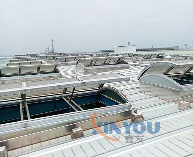 圓拱形的設計,外觀優美、通風排煙兼顧自然采光,可實現消防聯動控制,開啟角度一般為30度到45度最大開啟角度為90°。 夏季有利于排水,冬季不積雪。采用單開或對開形式。天窗啟閉按群組控制,每組天窗數根據天窗數量及控制距離決定。